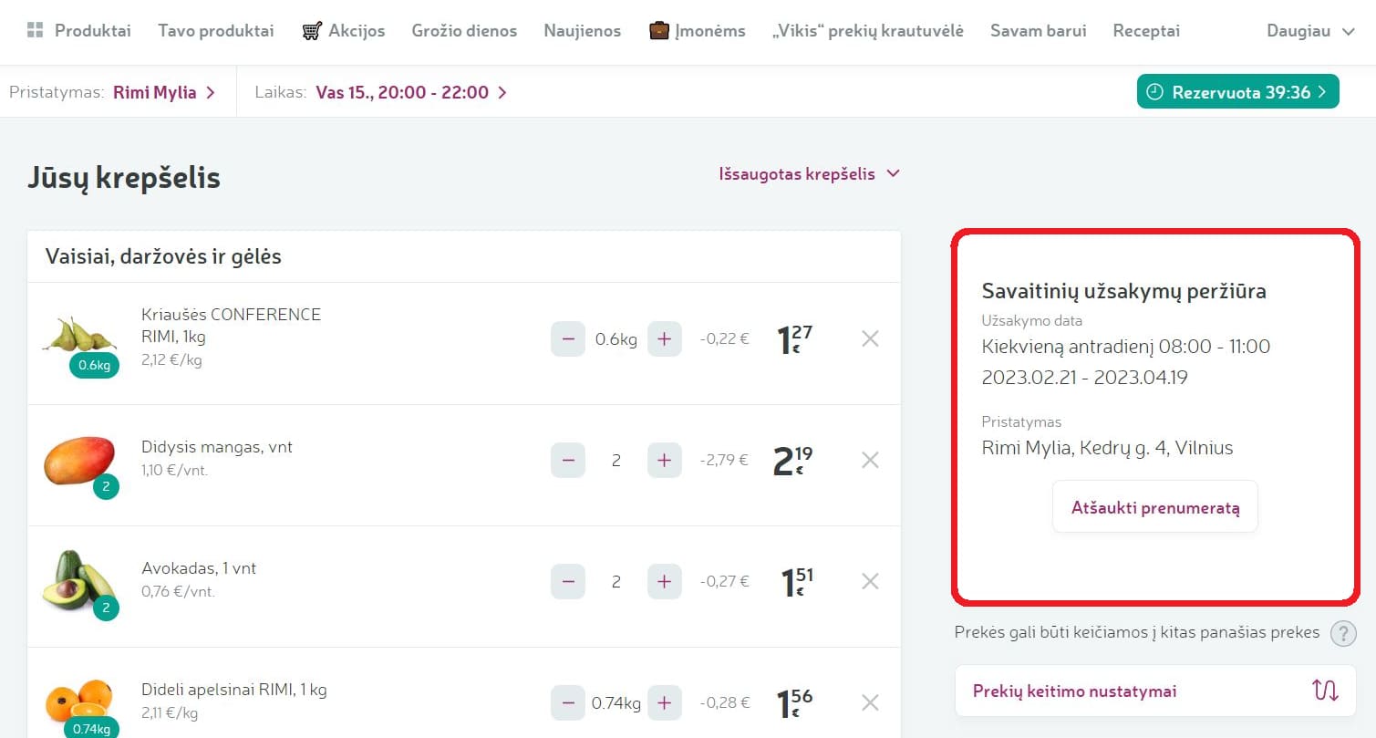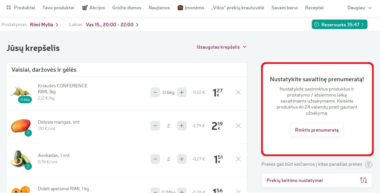 Nuo šiol „Rimi“ e. parduotuvėje galite užsiprenumeruoti savo pasirinktą pirkinių krepšelį pristatymui į namus ar atsiėmimui parduotuvėje. Pasirinkę norimą pristatymo laiką, ateinančius du mėnesius tuo pačiu laiku bei tuo pačiu būdu, pasirinktinai kas savaitę arba kas dvi, gausite savo pasirinktų prekių krepšelį.