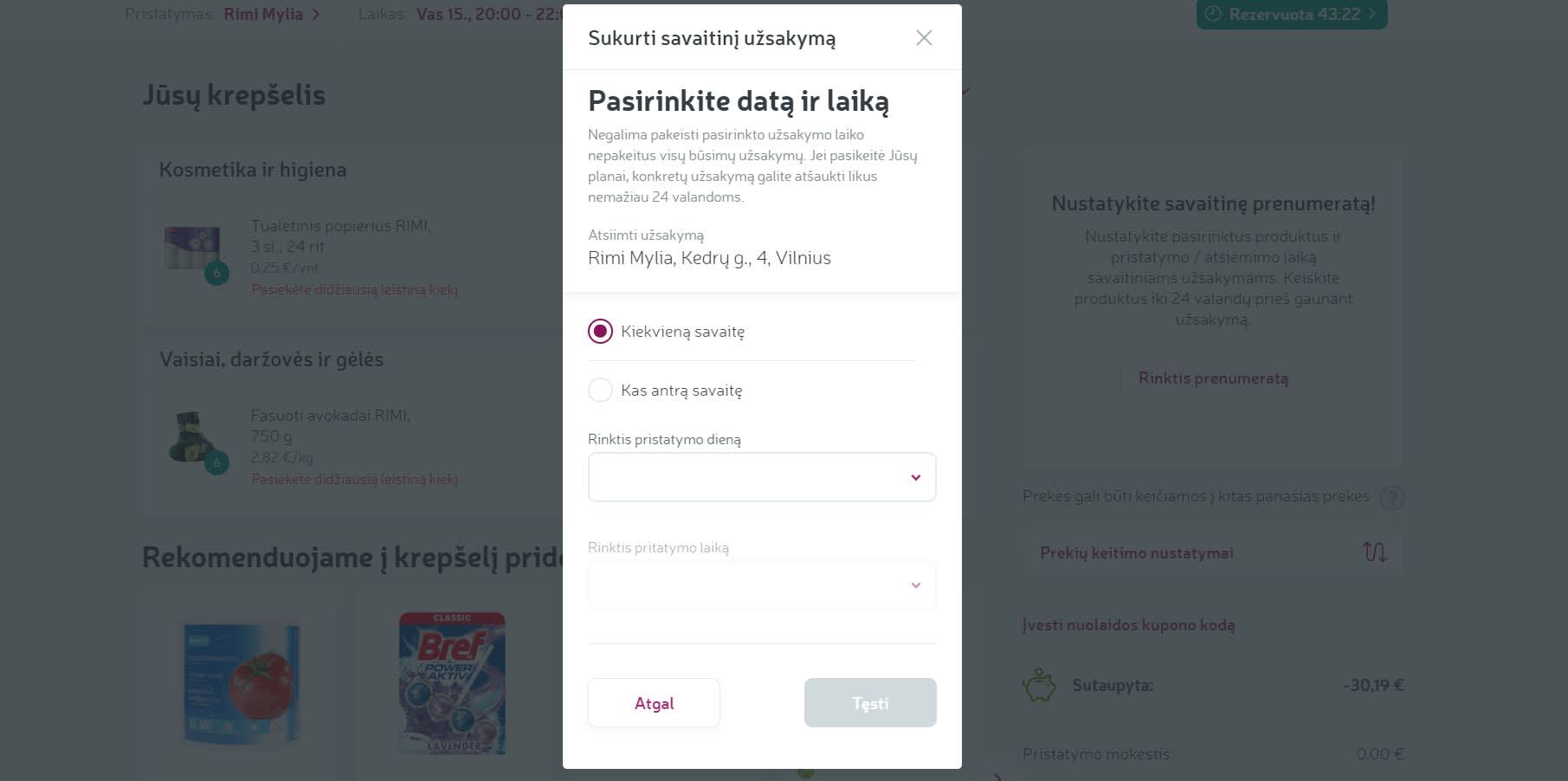 2. Pasirinkite, kaip dažnai, kurią savaitės dieną ir kokiu dienos metu norite gauti prenumeratoje pasirinktą prekių krepšelį.