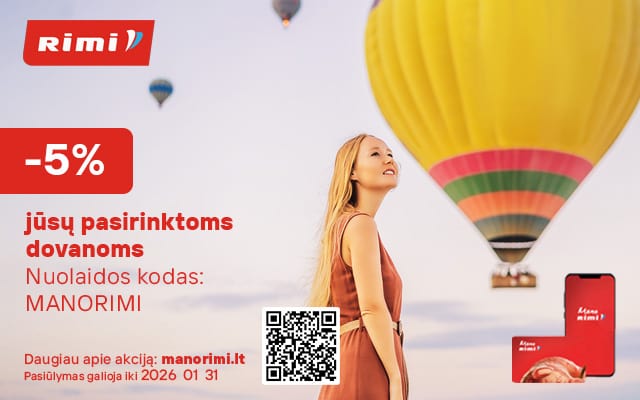 Iki 2026 01 31 užsuk į www.laisvalaikiodovanos.lt ir su nuolaidos kodu MANORIMI gauk 5 % nuolaidą DOVANOMS!