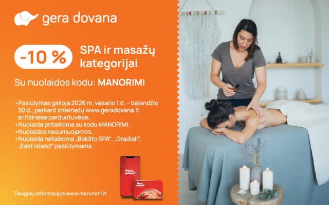 Iki 2026 04 30 užsuk į www.geradovana.lt ir su nuolaidos kodu MANORIMI gauk -10 % nuolaidą SPA ir masažų kategorijai!