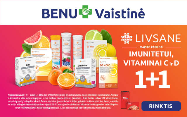 Tik „Benu“ vaistinėse LIVSANE maisto papildams IMUNITETUI, VITAMINUI C ir D 1+1 su „Mano Rimi“ kortele!