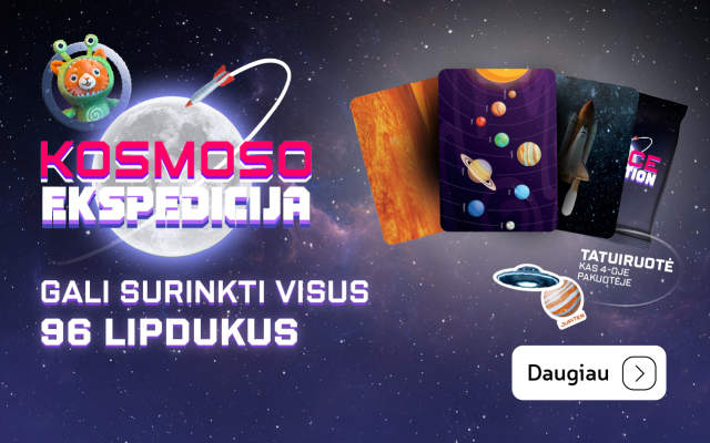 Visą 96 lipdukų kolekciją gali rinkti specialiame kosmoso albume, o pliušinius kosmoso žaislus ir kombinezonus gali įsigyti iki 60 % pigiau!