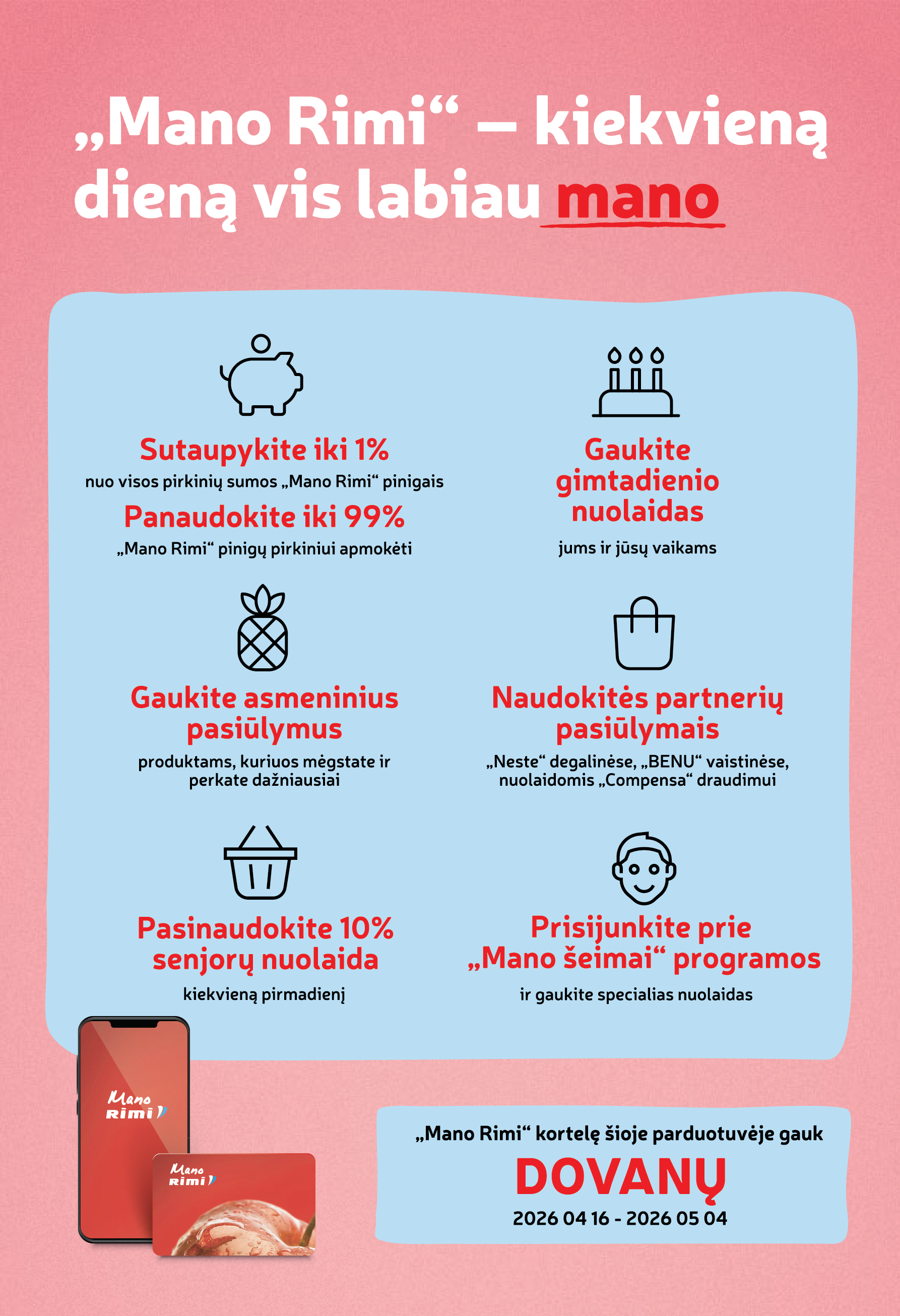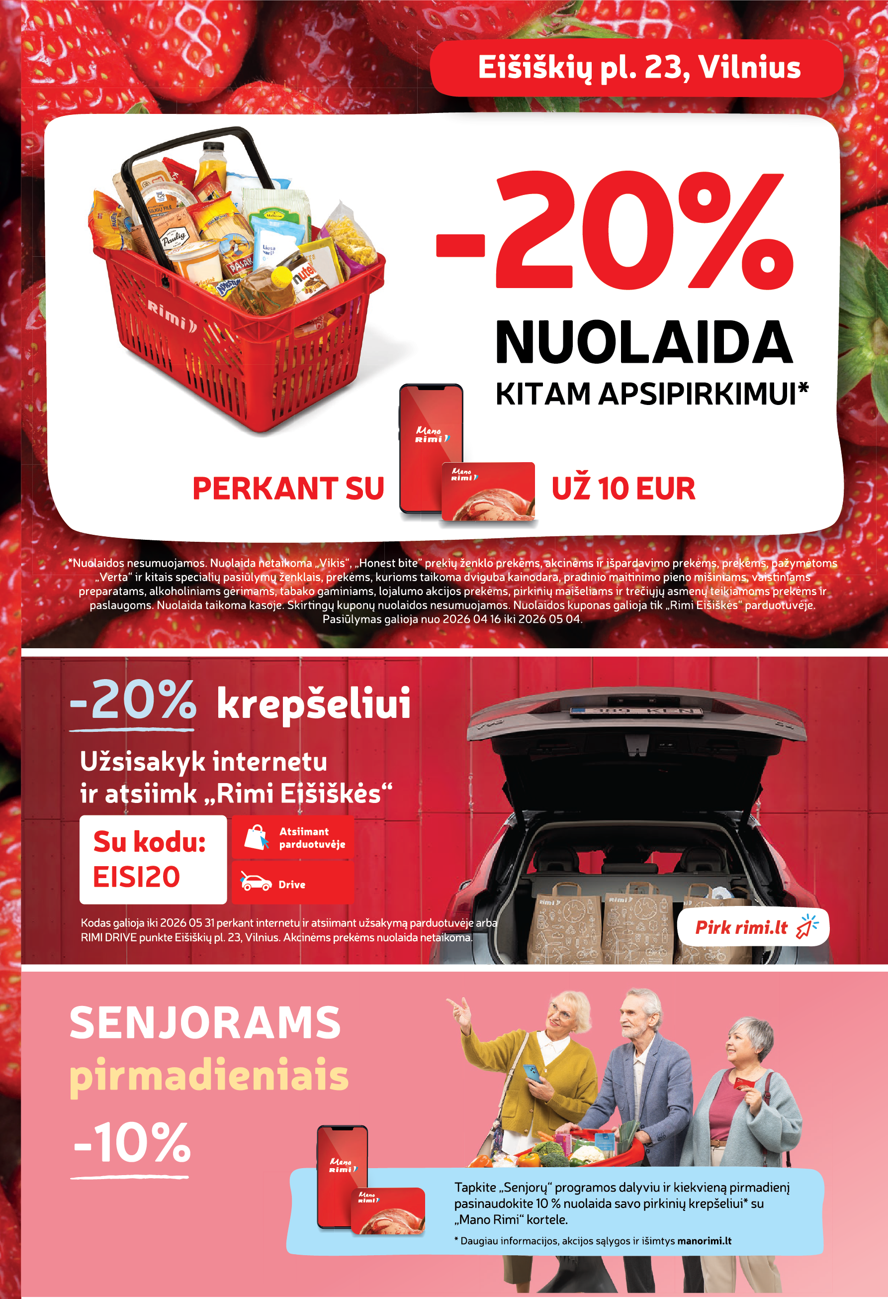 Jau balandžio 16 dieną, ketvirtadienį, 12 val. susitikime naujoje Rimi parduotuvėje Vilniuje, Eišiškių pl. 23. Atidarymo dieną jūsų laukia pasiūlymai už SUPER kainą, staigmenos ir lojalumo kortelė dovanų.