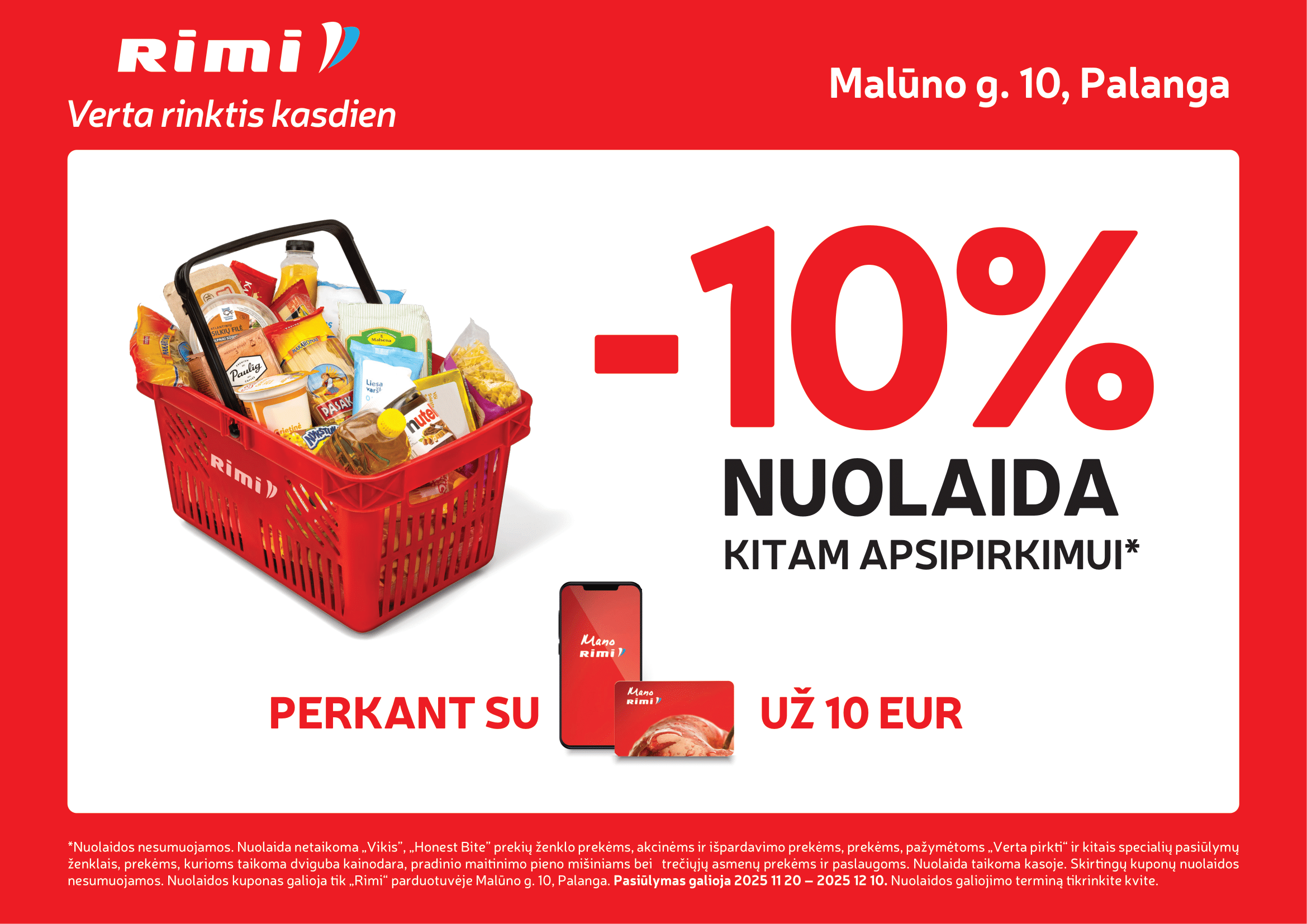 Lapkričio 20 - Gruodžio 10 dienomis apsipirk su „Mano Rimi“ kortele ar programėle bent už 10 Eur ir gauk 10% nuolaidos kvitą kitam apsipirkimui šioje Rimi parduotuvėje.