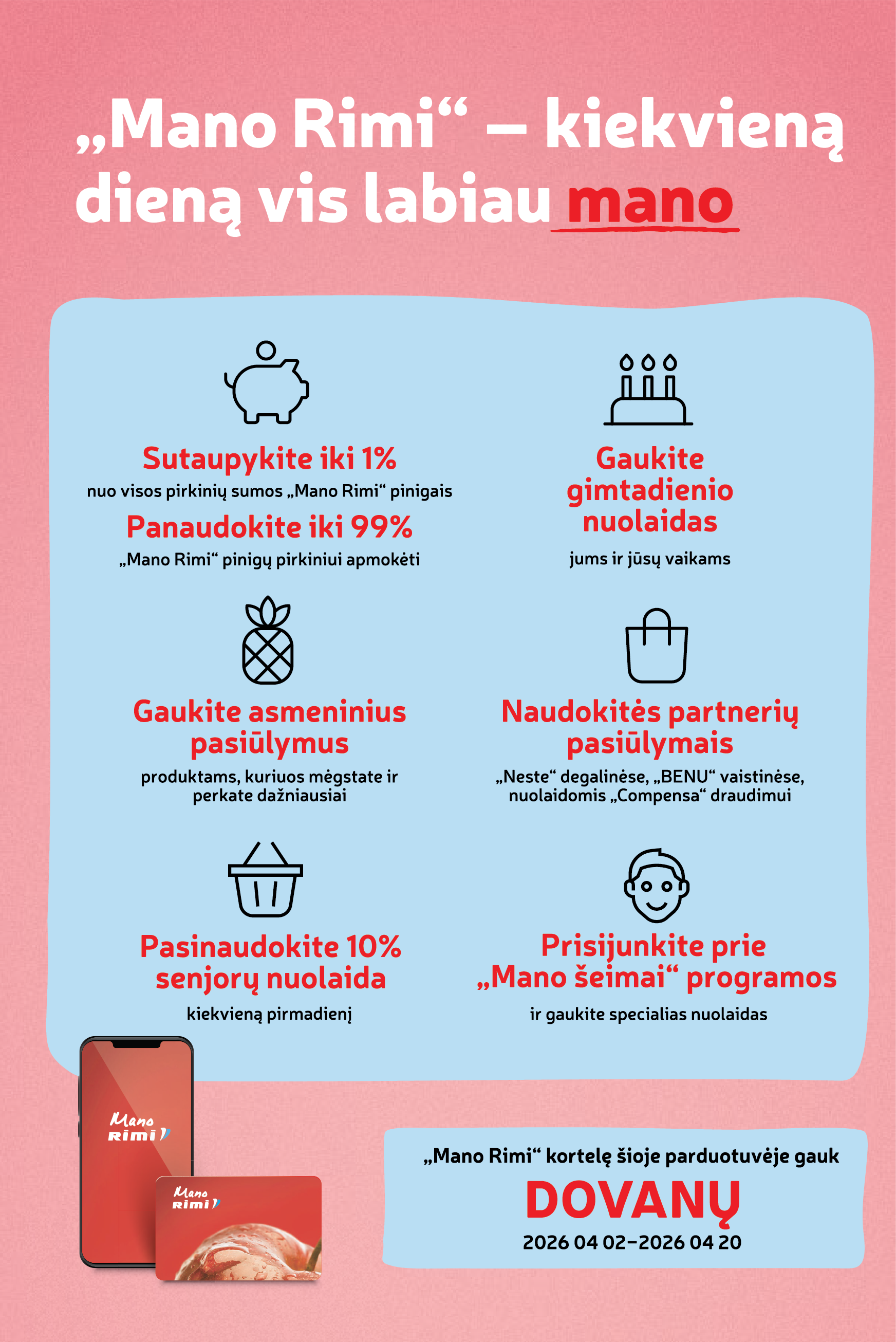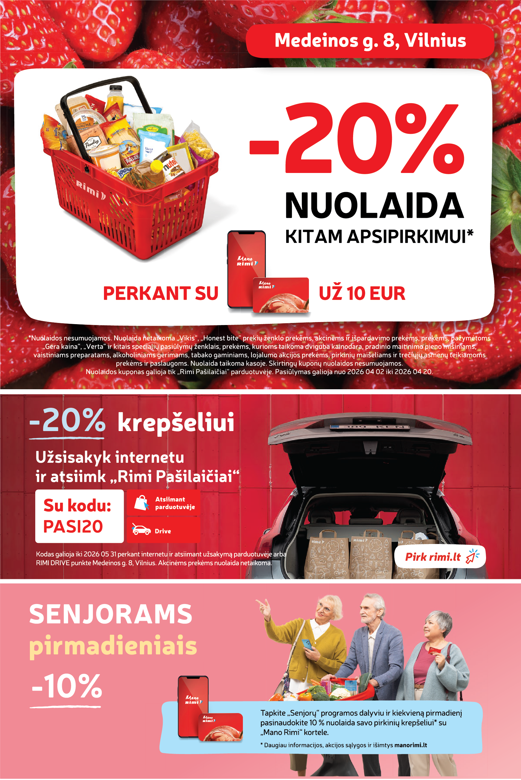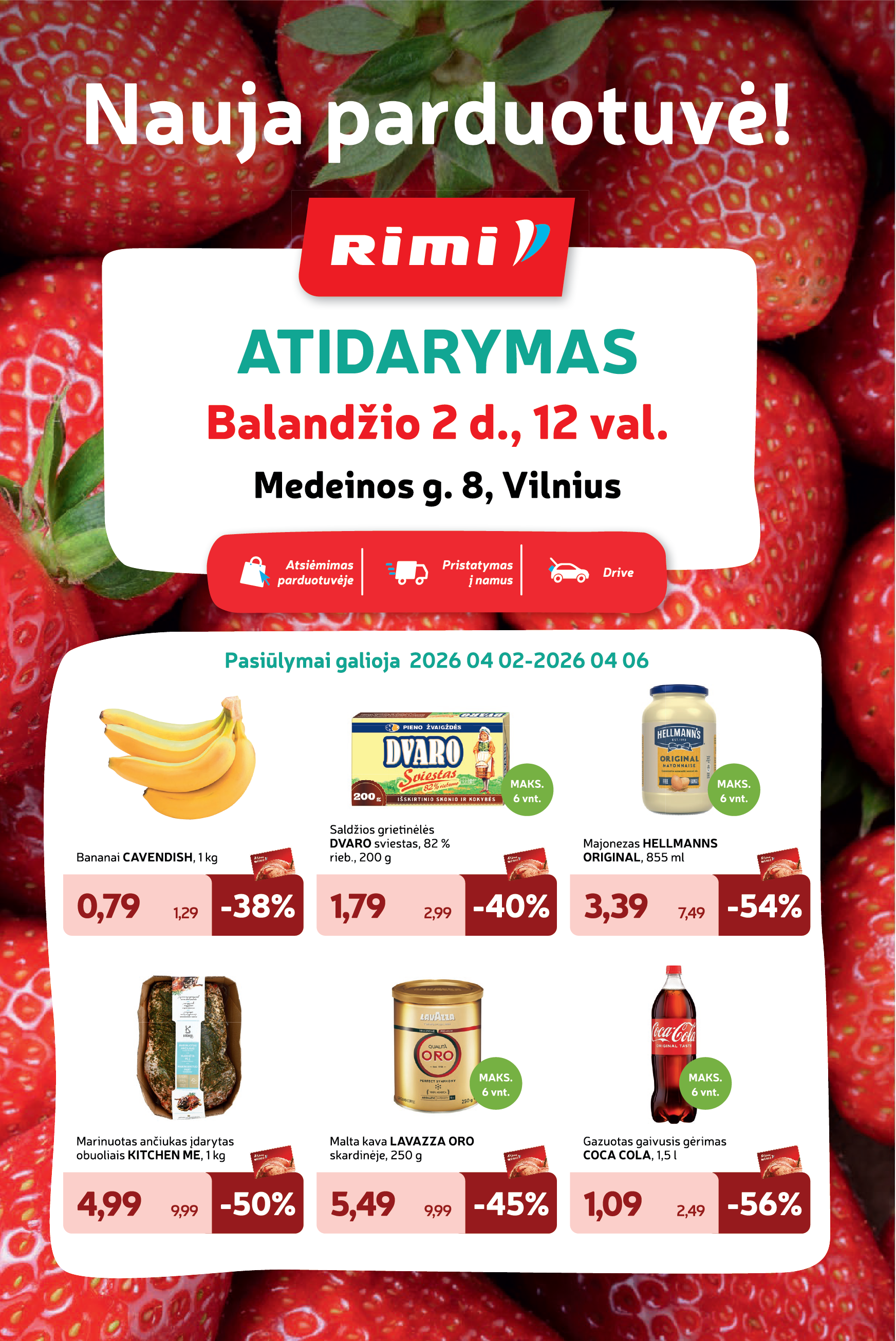 Jau balandžio 2 dieną, ketvirtadienį, 12 val. susitikime naujoje Rimi parduotuvėje Vilniuje, Medeinos g. 8. Atidarymo dieną jūsų laukia pasiūlymai už SUPER kainą, staigmenos ir lojalumo kortelė dovanų.