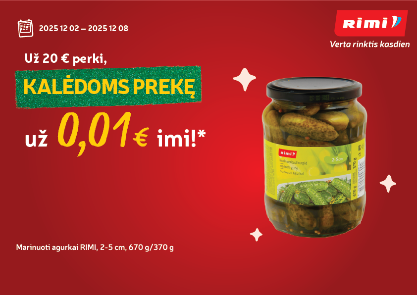 *Pasiūlymas galioja 2025 11 18 - 2025 12 29 „RIMI Lieporiai“ ir „RIMI Kėdainiai“ parduotuvėse. Į galutinę 20 € ar daugiau pirkinių sumą neįskaičiuojama vertė šių prekių: tabako gaminių, alkoholinių gėrimų ir depozito, pradinio maitinimo ir specializuotų kūdikių mišinių, nereceptinių vaistų, „Rimi“ dovanų kortelių ir čekių, loterijos bilietų, trečiųjų asmenų teikiamų paslaugų (išankstinio mokėjimo kortelių papildymų, sąskaitų apmokėjimo, elektroninių bilietų, superkamos ir (ar) keičiamos taros ir kt.), spaudos ir „Rimi“ maišelių. To paties apsipirkimo metu pirkdami už 20 € po 1 ct galite įsigyti 1 savaitės prekę, už 40 € - 2 savaitės prekes, už 60 € ar daugiau - 3 savaitės prekes. Akcijos prekių skaičius ribotas. Daugiau informacijos https://www.rimi.lt/savaites-preke