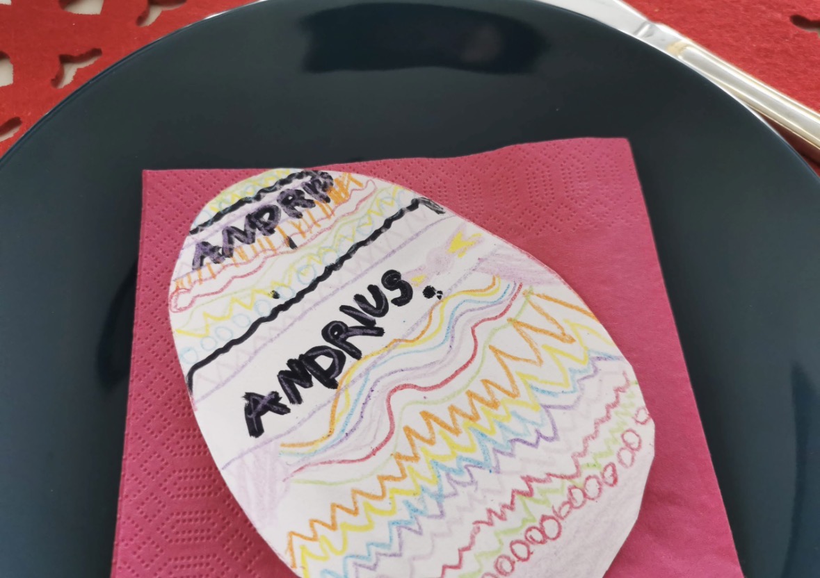 Dar viena labai jauki ilgametė mūsų šeimos tradicija – Velykų ryto papuošimai kiekvienam svečiui. Vaikai iš anksto gamina nedideles dekoracijas, kurios Velykų rytą atsiduria prie kiekvienos lėkštės.