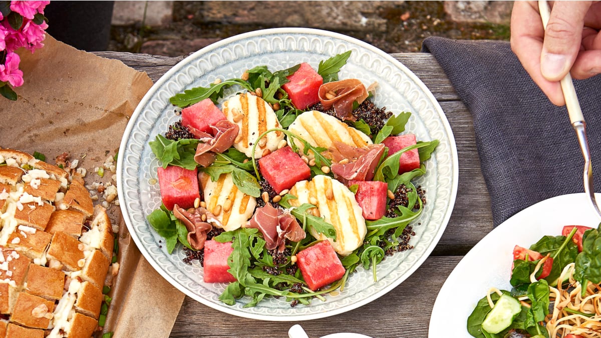 „Rimi“ kulinarijos technologė Lina Barčaitė kviečia paminėti Tarptautinę arbūzo dieną ruošiant gaivias salotos su grilyje keptu Halloumi sūriu, bolivine balanda ir arbūzu.