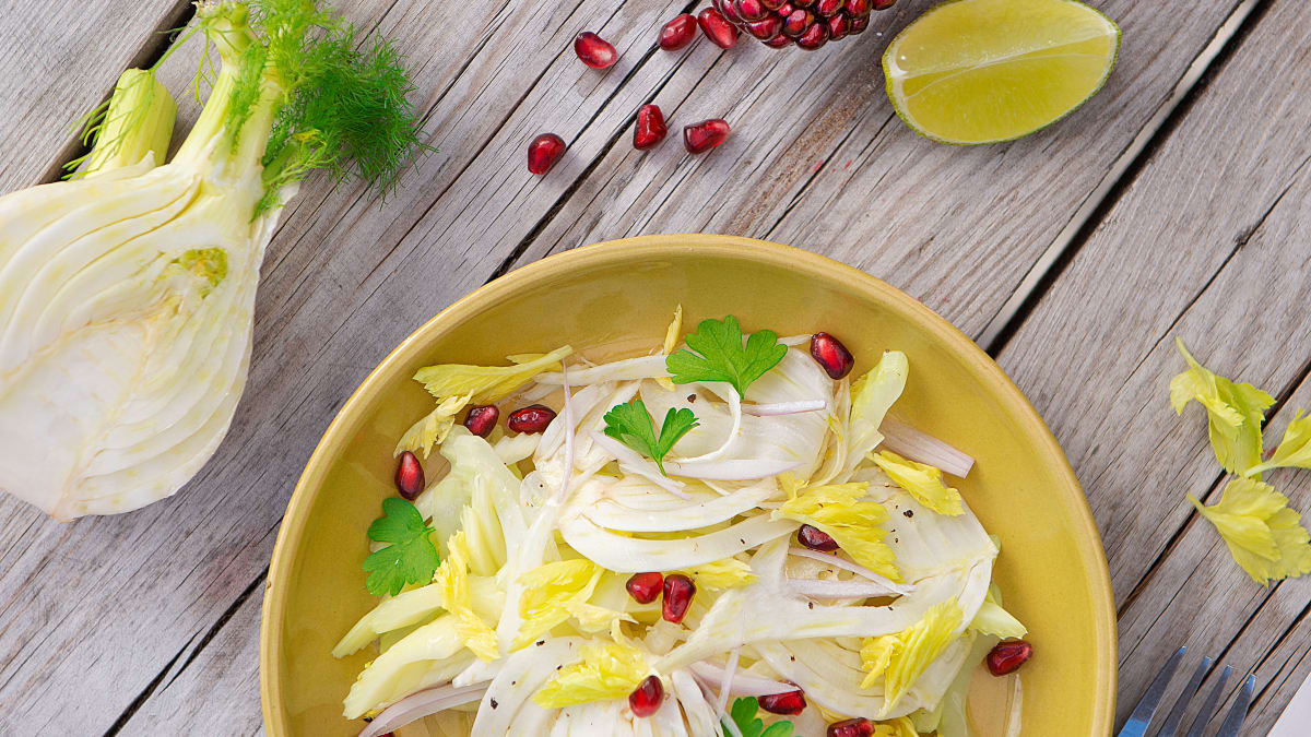 Gaivios pankolių, salierų ir granatų salotos